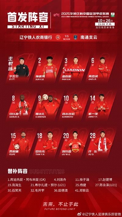 6686体育10月26日讯 中甲联赛事第28轮,辽宁铁人主队场迎战南通支云,赛前双方首发出炉。