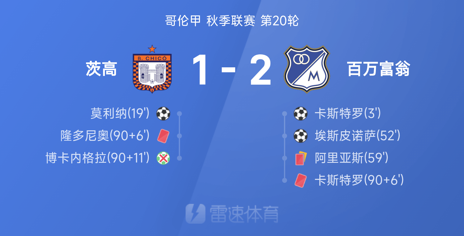 6686体育11月13日讯 25赛季哥伦甲秋季联赛事第20轮,百万富翁2-1战胜茨高。全场竞赛,埃斯皮诺萨发挥出色贡献1射1传,卡斯特罗破门建功,莫利纳破门难救主,博卡内格拉在最后时刻读秒失点,卡斯特罗、隆多尼奥染红。