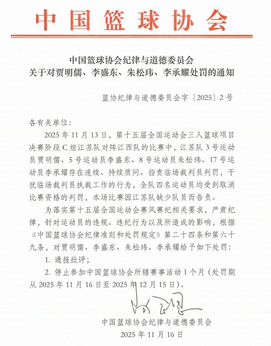 6686体育11月16日讯 中国篮球协会纪律与道德委员会官方宣布,给予全运会三人篮球项目江苏队队员贾明儒、李盛东、朱松玮和李承耀通报批评和停顿参加中国篮协所辖赛会活动1个月的处罚,原因是他们四人存在连续、持续质问、指责临场裁判员员裁决、干扰临场裁判员员执裁工作的行为。公告原文如下: