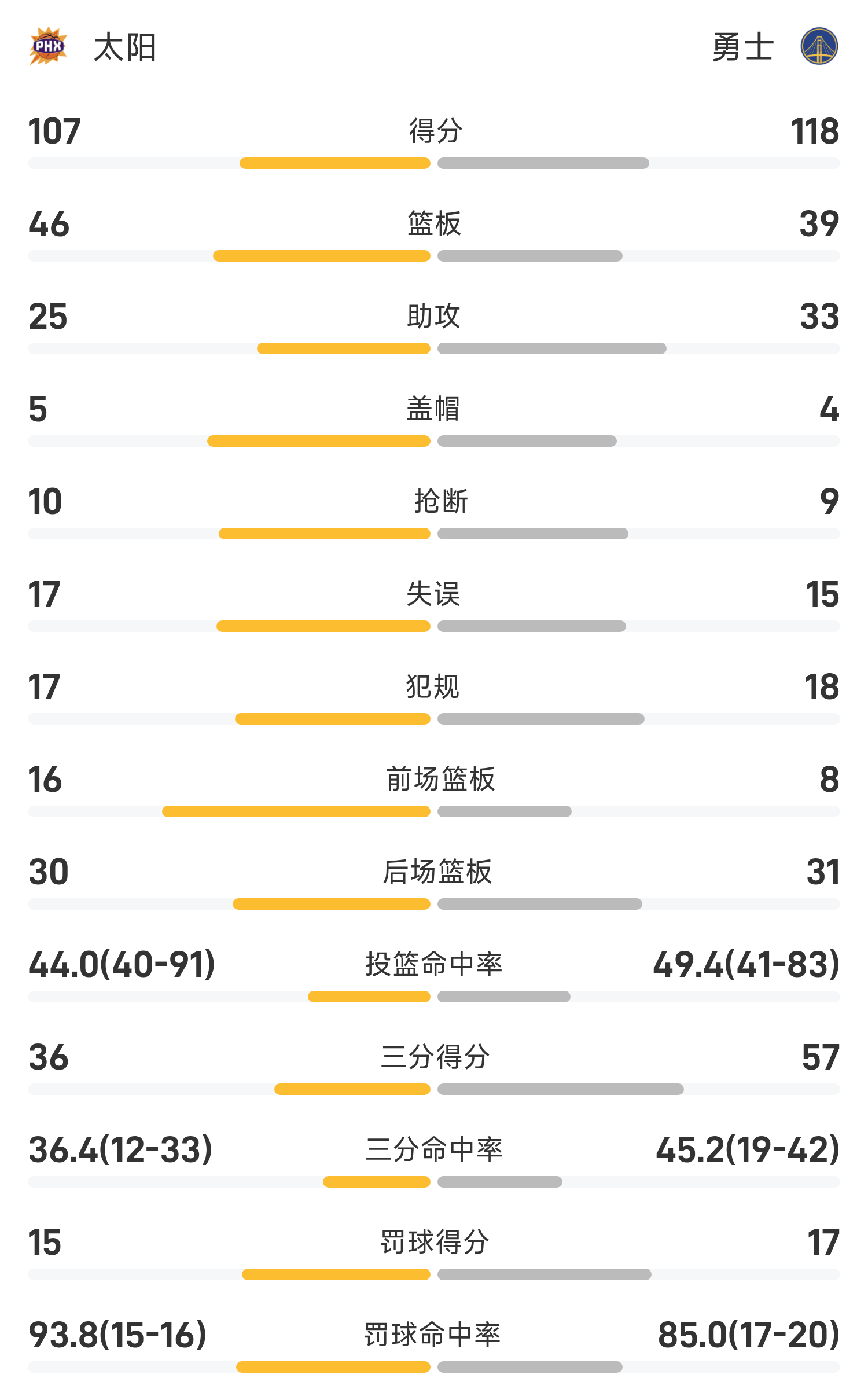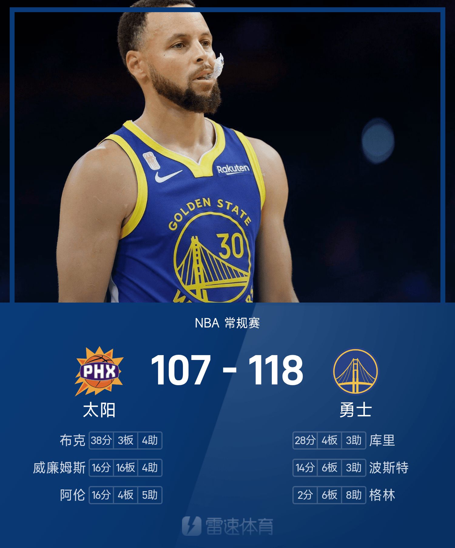 NBA战报:库里28分,布克空砍38分,勇士118-107击败太阳