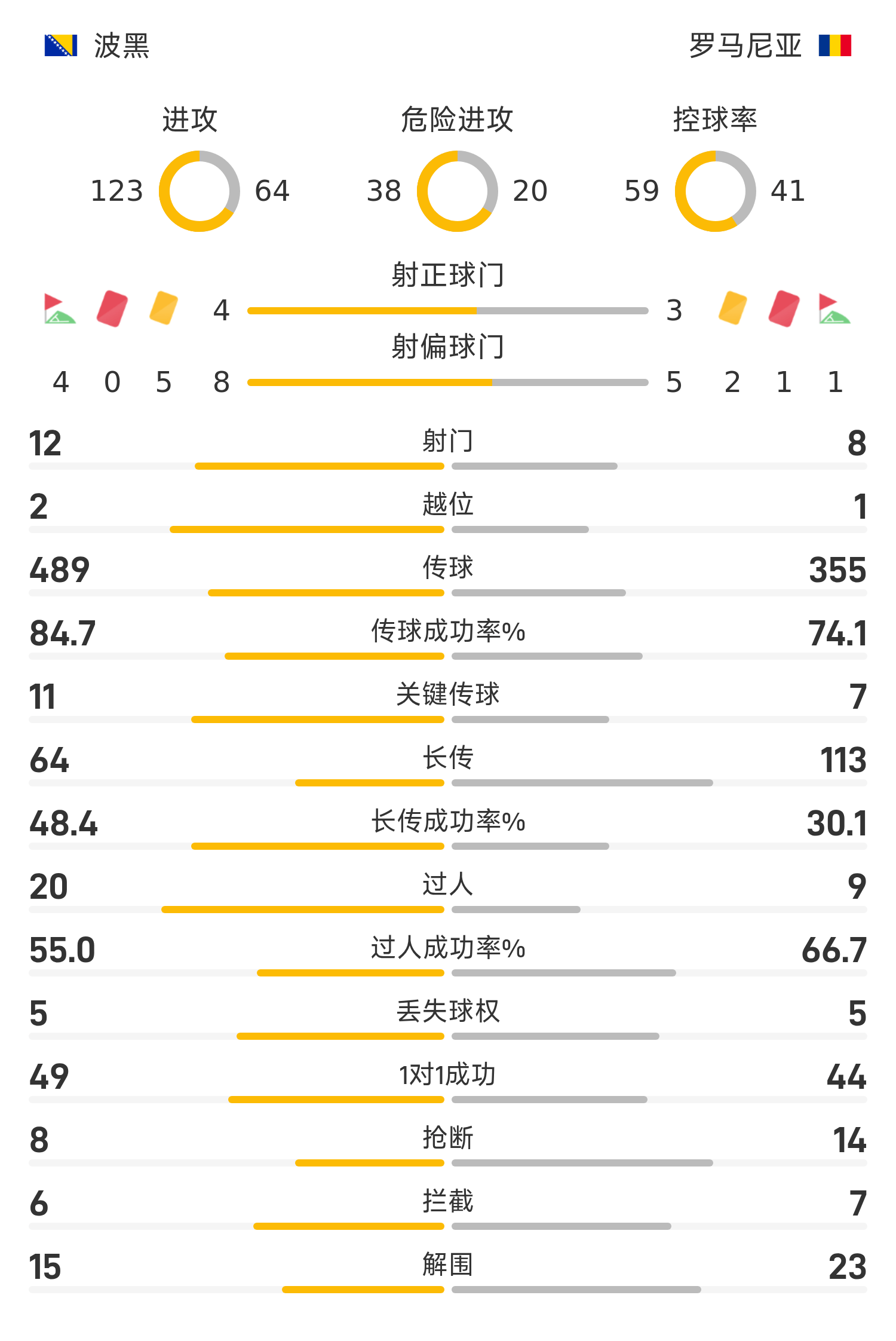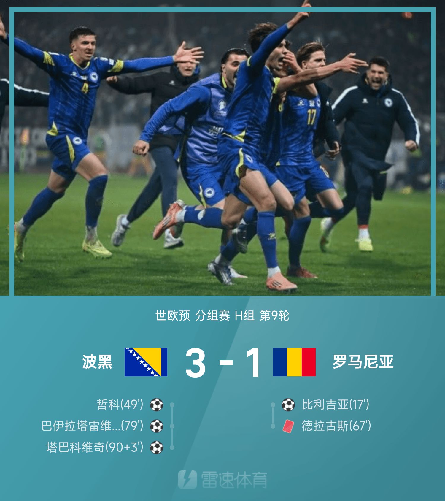 6686体育11月16日讯 26赛季世欧预分组赛H组第9轮,波黑坐镇主队场迎战罗马尼亚。上半场,罗马尼亚梦幻开局,比利吉亚破门建功。下半场,波黑开端发力,哲科破守门员赛果分扳平。德拉古斯上场两分球钟严重违例染红罚下,罗马尼亚十人应战波黑。第79分钟,巴伊拉塔雷维奇世界波破门逆转局,塔巴科维奇破门锁定战局。比利吉亚破门难救主。最终,波黑3-1战胜十人罗马尼亚。