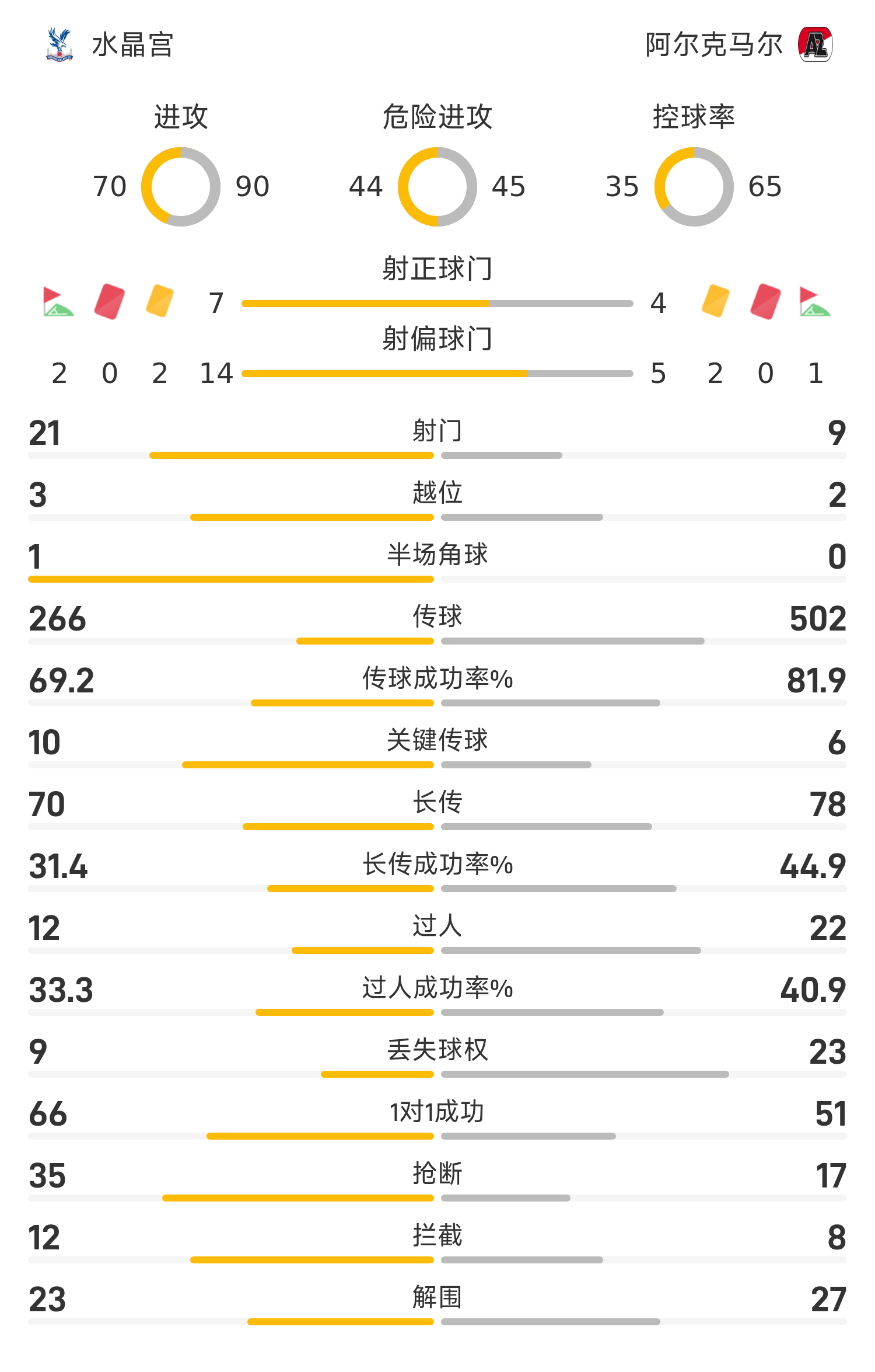 阿尔克马尔首发阵容:1-奥杜罗、5-佩内特拉、3-高斯、15-查韦斯、22-迪克斯特拉(62’34-德威特)、6-库普梅纳斯(80’4-德克)、10-米吉南、26-史密特(80’74-布加德)、11-萨迪丘、9-帕洛特(74’25-泽弗里克)、7-韦斯利(61’17-延森)