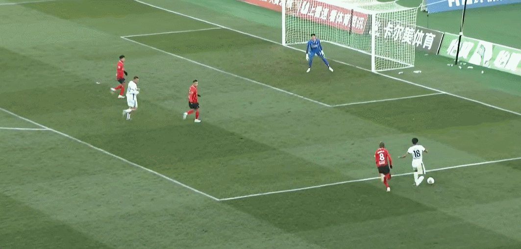 8’邦本宜裕三秒区外带球摆脱守卫起左脚外围射门,李冠希将球挡出