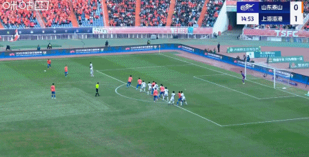 50’泰山右路传禁区,克雷桑前点俯身冲顶,皮球击中横梁
