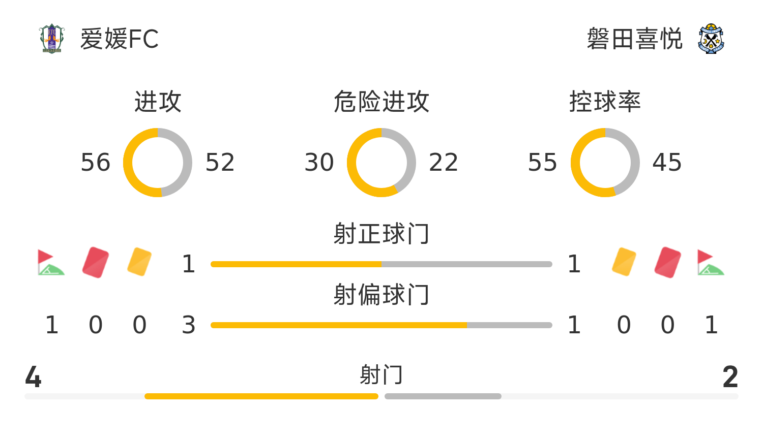 爱媛FC首发阵容:36-辻周吾、37-石尾崚雅、19-黒石贵哉、25-吉田温纪、44-森山公弥、7-曾根田穣、24-甲田英将、28-前田椋介、8-深泽佑太、13-堀米勇辉、32-藤本佳希