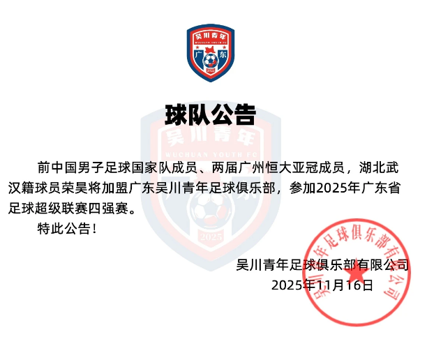 6686体育11月16日讯 广东吴川青年足球俱乐部发布公告,38岁的前国脚荣昊正式加盟。