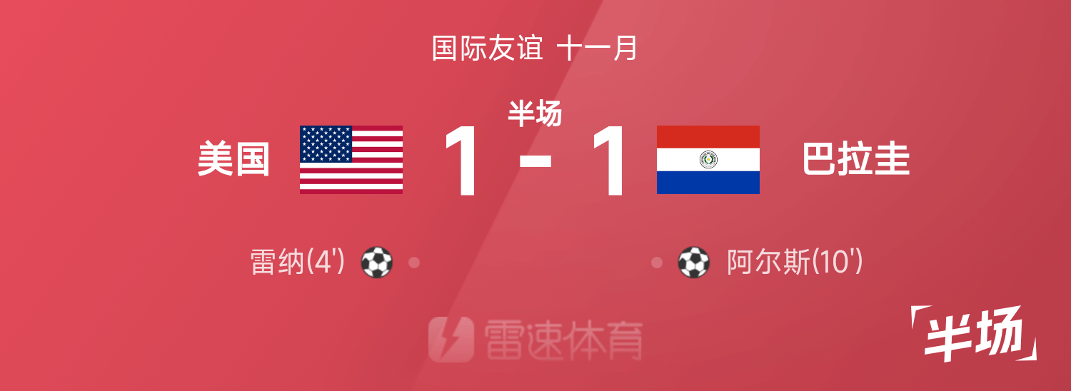 友谊赛半场:雷纳闪击,阿尔斯扳平,美国暂1-1巴拉圭