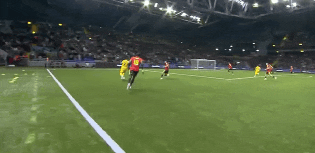 27’比利时前场撞墙协作,范纳肯弧顶抽射攻门未能发上力量