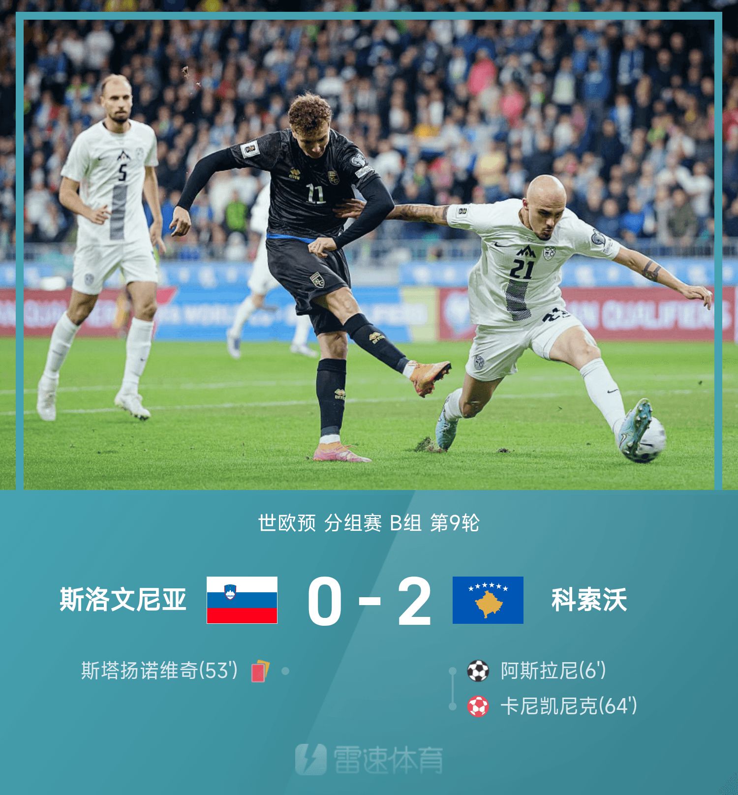 6686体育11月16日讯 26赛季世欧预分组赛B组第9轮,科索沃2-0战胜斯洛文尼亚。全场竞赛,阿斯拉尼三秒区内戏耍对手破门,卡尼凯尼克打入乌龙球世界波,斯塔扬诺维奇后备队员登场连吃两黄被罚下,奥布拉克屡献神扑难救主。