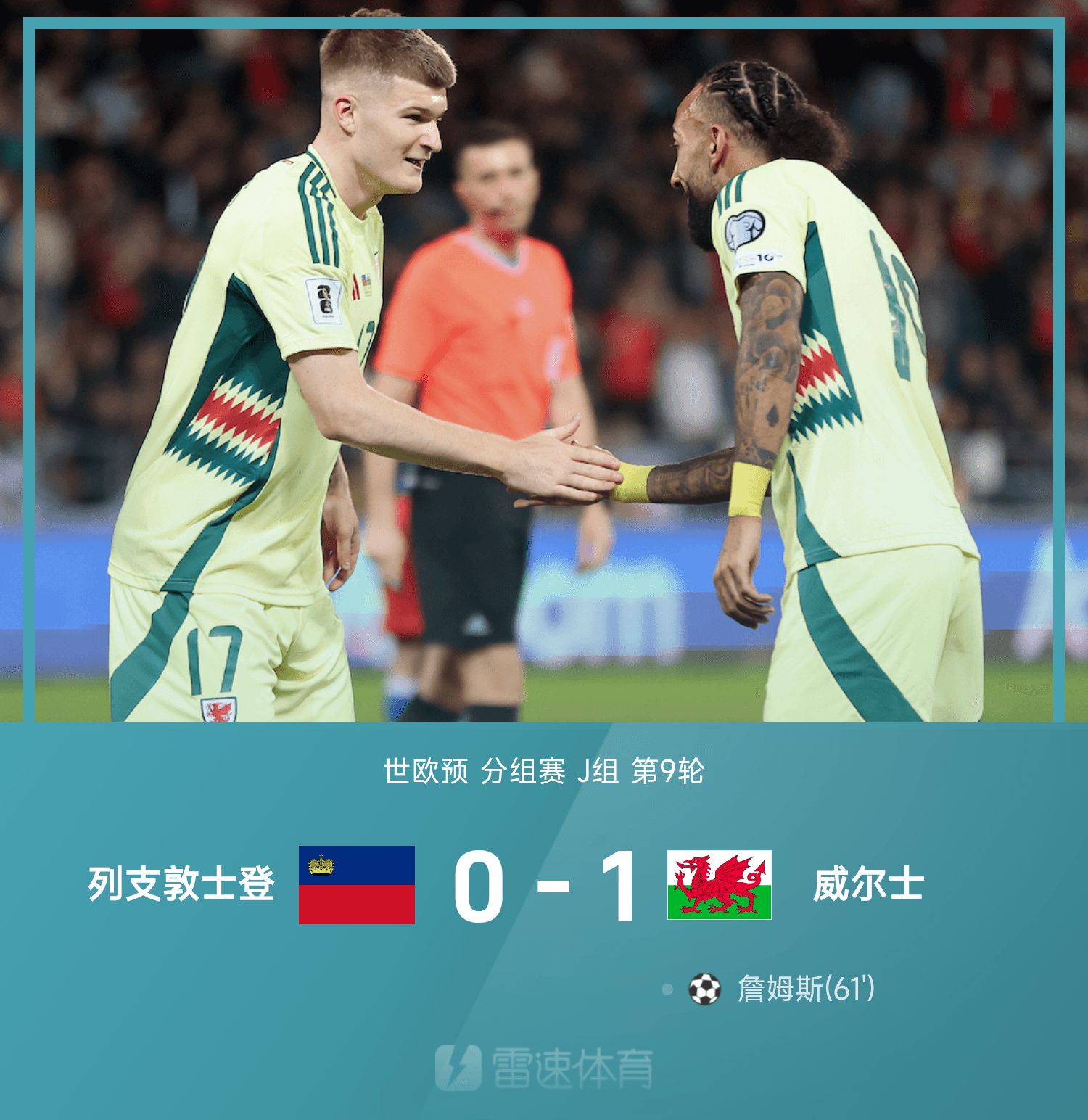 6686体育11月16日讯 26赛季世欧预分组赛J组第9轮,列支敦士登坐镇主队场迎战威尔士。上半场,布罗德黑德破门,裁判员介入视频裁判判定进球无效。下半场,第61分钟,詹姆斯破门打进全场唯一进球锁定战局。最终,威尔士1-0险胜列支敦士登,威尔士分组赛有望晋级世杯赛名额。