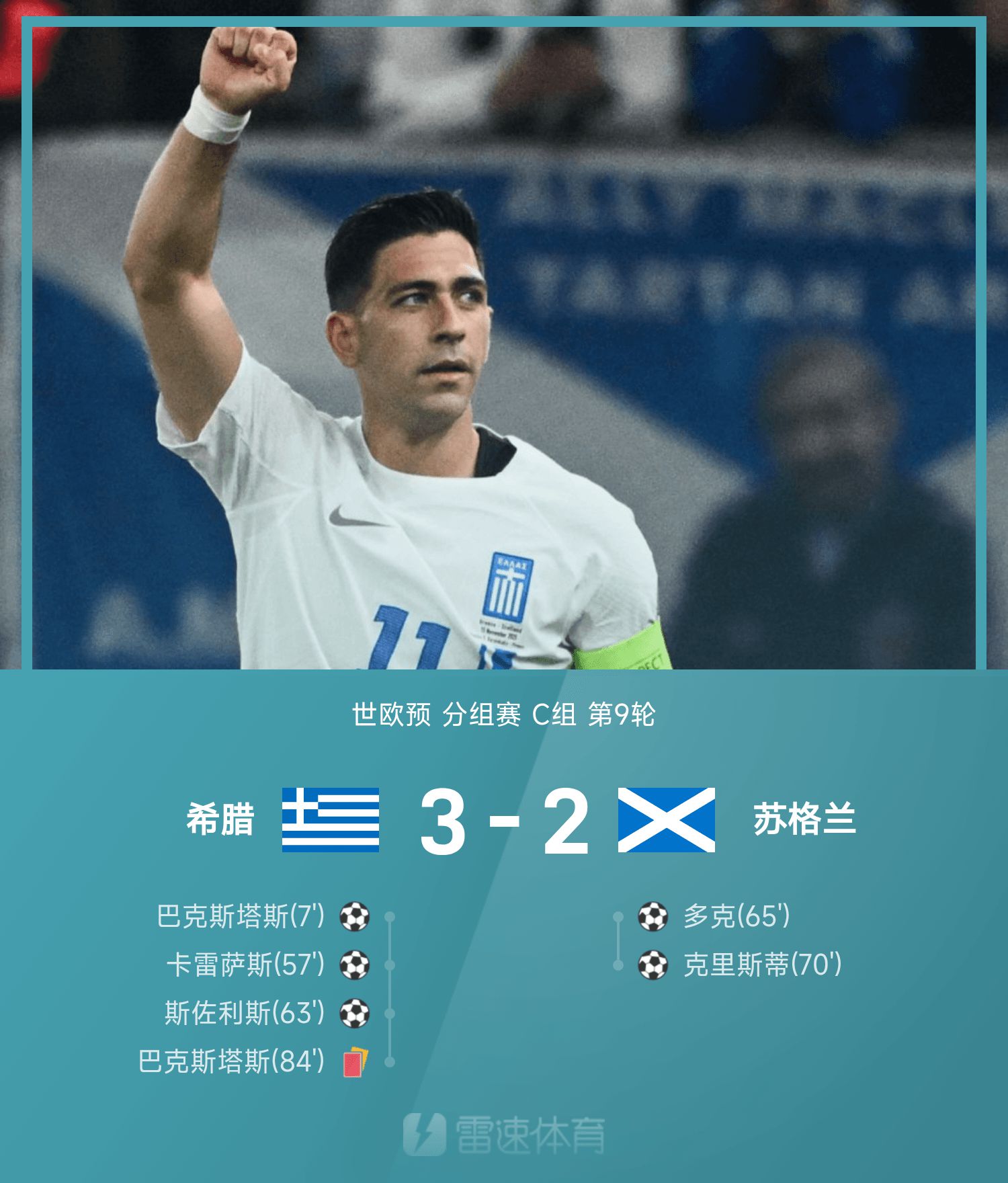 世欧预战报:巴克斯塔斯破门+染红,十人希腊3-2苏格兰