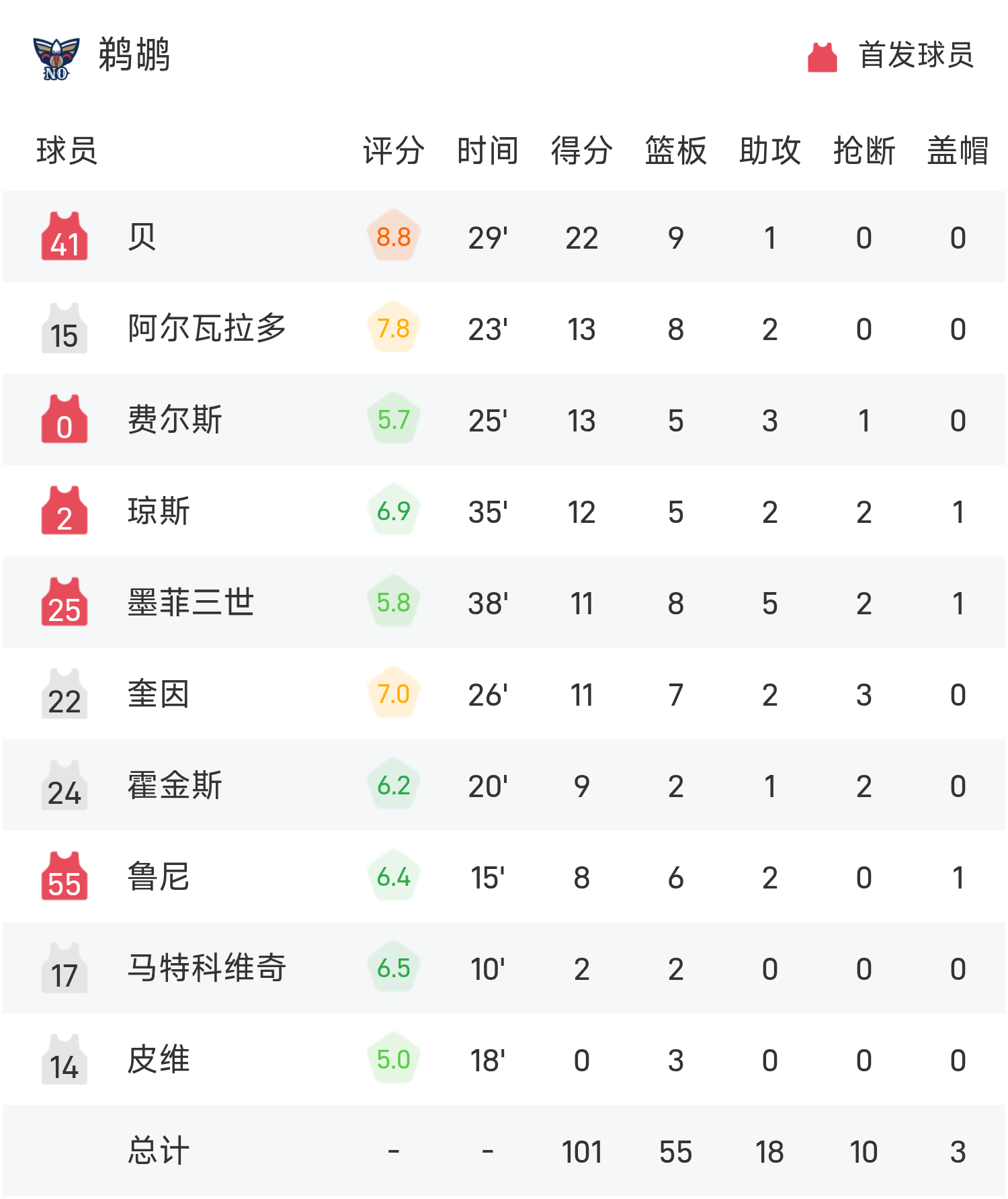 贝砍下全场最高的22分9板1助,率领鹈鹕胜利取胜,独行侠状元弗拉格错失绝平,得到20分。