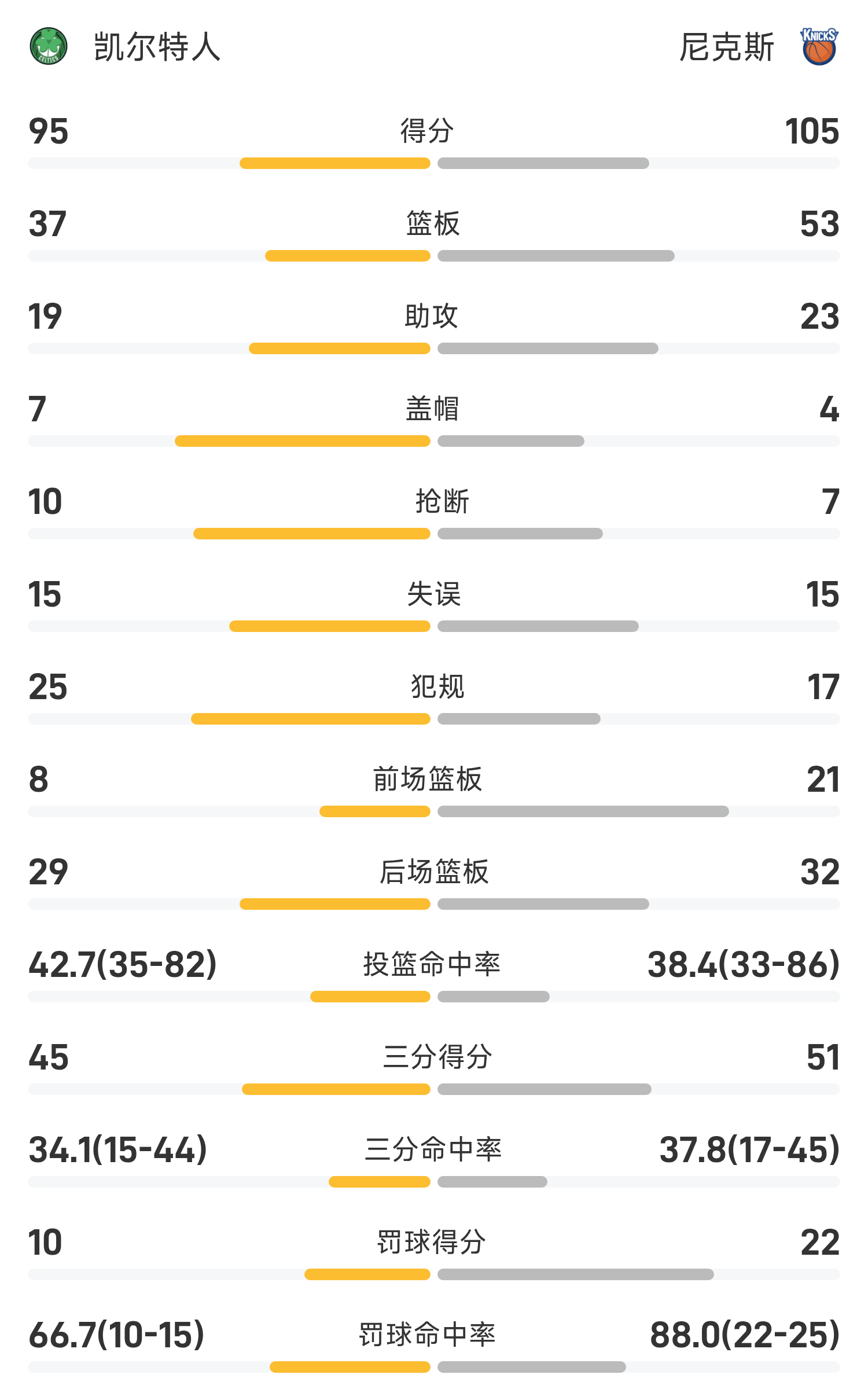 6686体育10月25日讯 25/26赛季NBA常规赛,尼克斯对阵凯尔特人。双方全场战罢,尼克斯105-95战胜凯尔特人。布伦森砍下全场最高的31分3板5助,率领尼克斯胜利取胜。