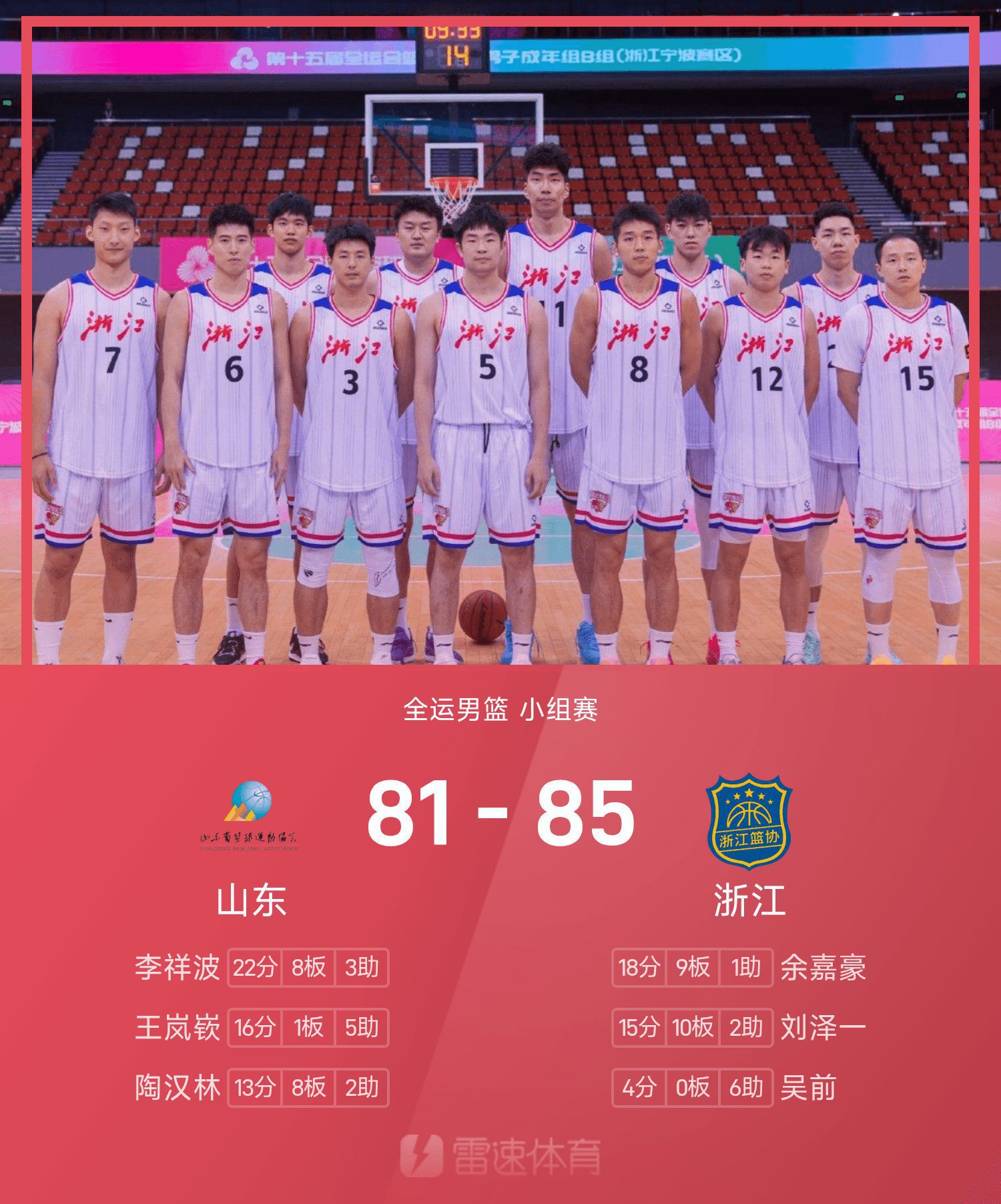 全运男篮战报:余嘉豪18分9板,浙江85-81险胜山东
