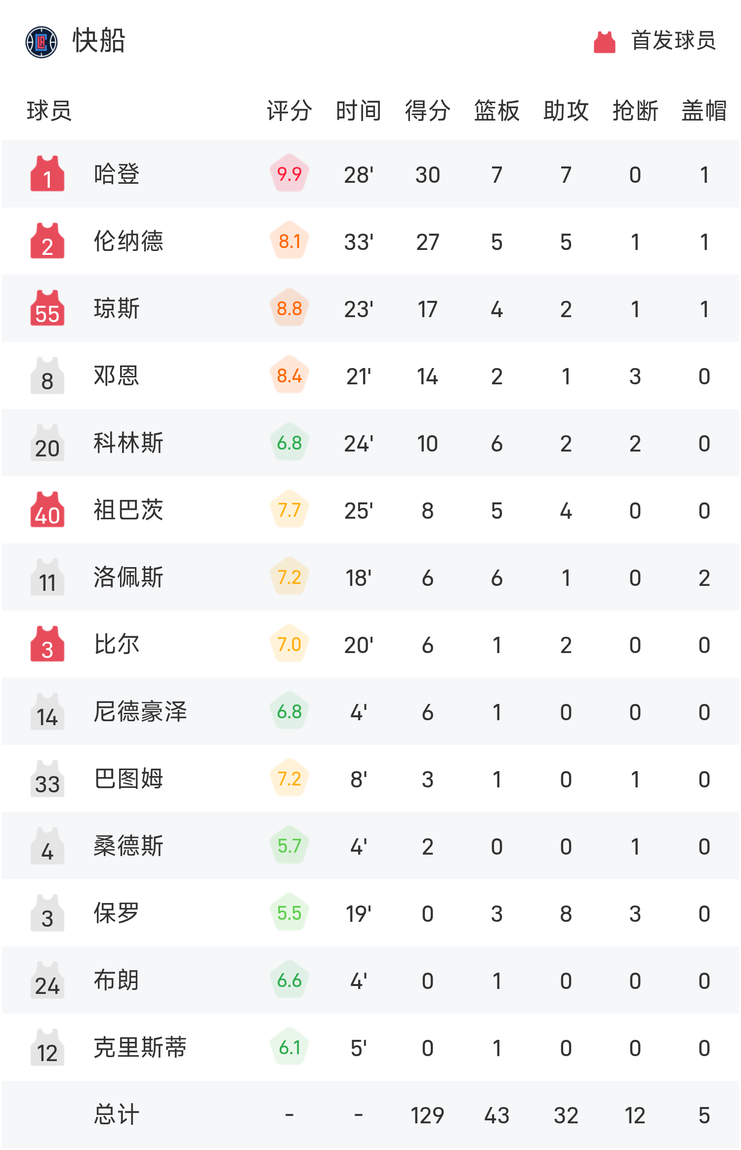 NBA战报:哈登30分7板7助,快船129-102大胜太阳