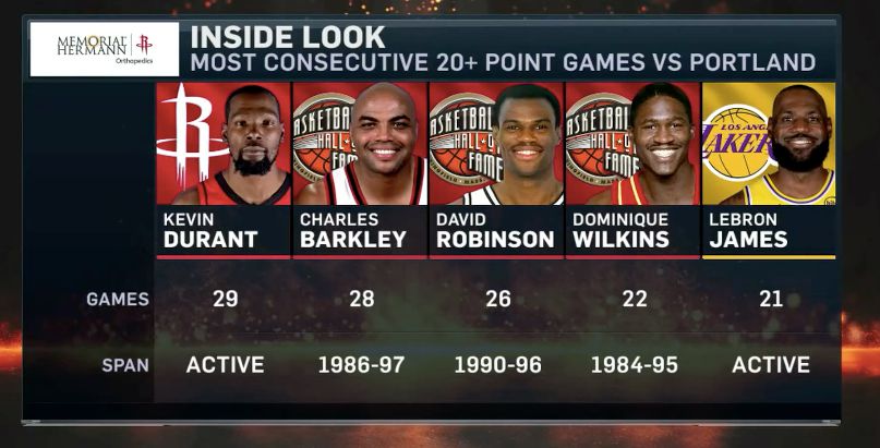 杜兰特上半场竞技状态火热,12投8中,拿到20分3抢篮板,这也是他面对开拓者连续30场轰下20+得分。